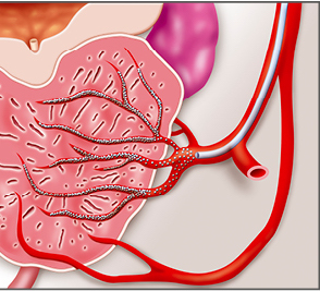 Under local anesthesia with mild sedation a tiny puncture is made in the wrist (radial artery) or groin (femoral artery). A microcatheter is navigated into the prostatic arteries. Microscopic embolic particles are released into the arteries supplying the prostate. These particles block the blood flow to the enlarged prostate tissue, causing the prostate to shrink naturally over time.